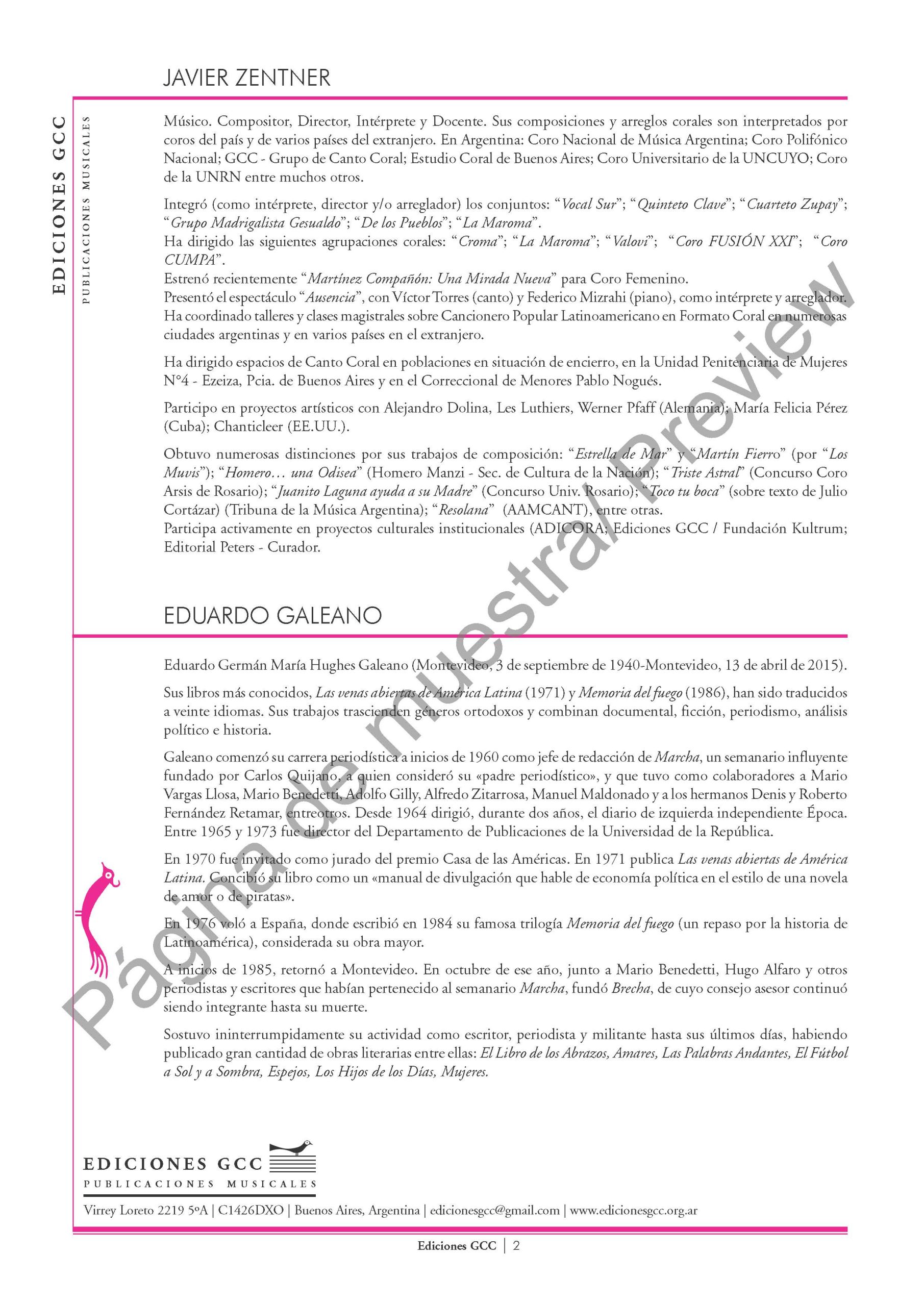 Autor: Javier Zentner Colección: Cuatro corales sobre “Memoria del fuego” Nro de catálogo: CA 1451 Coro: Mixto Voces: SATB div Dificultad: Género: Corales Música: Javier…